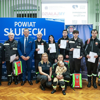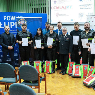 W sali herbowej Starostwa Powiatowego w Słupcy odbyło się uroczyste wręczenie plecaków modułowych uczestnikom kursów pierwszej pomocy realizowanych w ramach projektu "Ratujmy życie! Ochotnicze służby ratunkowe pierwsze na miejscu (pierwszy ratownik - first responder".