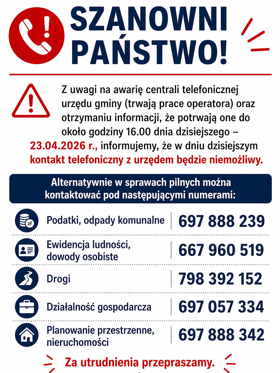 Obecnie trwają prace operatora, a utrudnienia mogą potrwać do godzin popołudniowych. W sprawach pilnych mieszkańcy mogą korzystać z podanych numerów kontaktowych do poszczególnych referatów, m.in. dotyczących podatków, ewidencji ludności czy dróg.