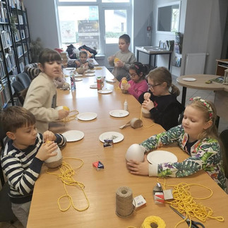 Natomiast uczestnicy zajęć w punkcie bibliotecznym w Kawnicach mieli okazję wziąć udział w wielu zabawach integracyjnych, w tym grze "Podaj dalej". Dzieci nie tylko poznały siebie nawzajem, lecz także dużo dowiedziały się o sobie samych. W trakcie zajęć rękodzielniczych uczestnicy przywoływali wiosnę, tworząc kolorowe jajka ze sznurka makramowego oraz wykonali laurki walentynkowe, które następnie wręczyli gościowi - niespodziance.