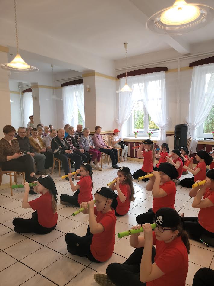 22 marca wybrali się z wizytą do Domu Pomocy Społecznej w Zagórowie, a 23 marca odwiedzili Centrum Opiekuńczo-Mieszkalne w Kopojnie. Pensjonariusze oraz pracownicy przyjęli członków koła teatralnego miło i serdecznie. Młodzi aktorzy zaprezentowali przedstawienie pt. ,,Wyprawa piratów”. Zostali nagrodzeni gromkimi brawami i usłyszeli wiele ciepłych słów na temat udanego spektaklu. Po występie zrobili sobie wspólne, pamiątkowe zdjęcia. Na koniec występujący zostali obdarowani słodyczami.