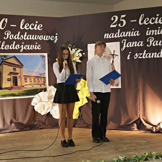Podczas uroczystości nie zabrakło wielu wspomnieć, podziękować i życzeń na kolejne lata działalności. Przed publicznością wystąpili uczniowie wraz z rodzicami oraz absolwenci Szkoły Podstawowej im. Jana Pawła II w Młodojewie.